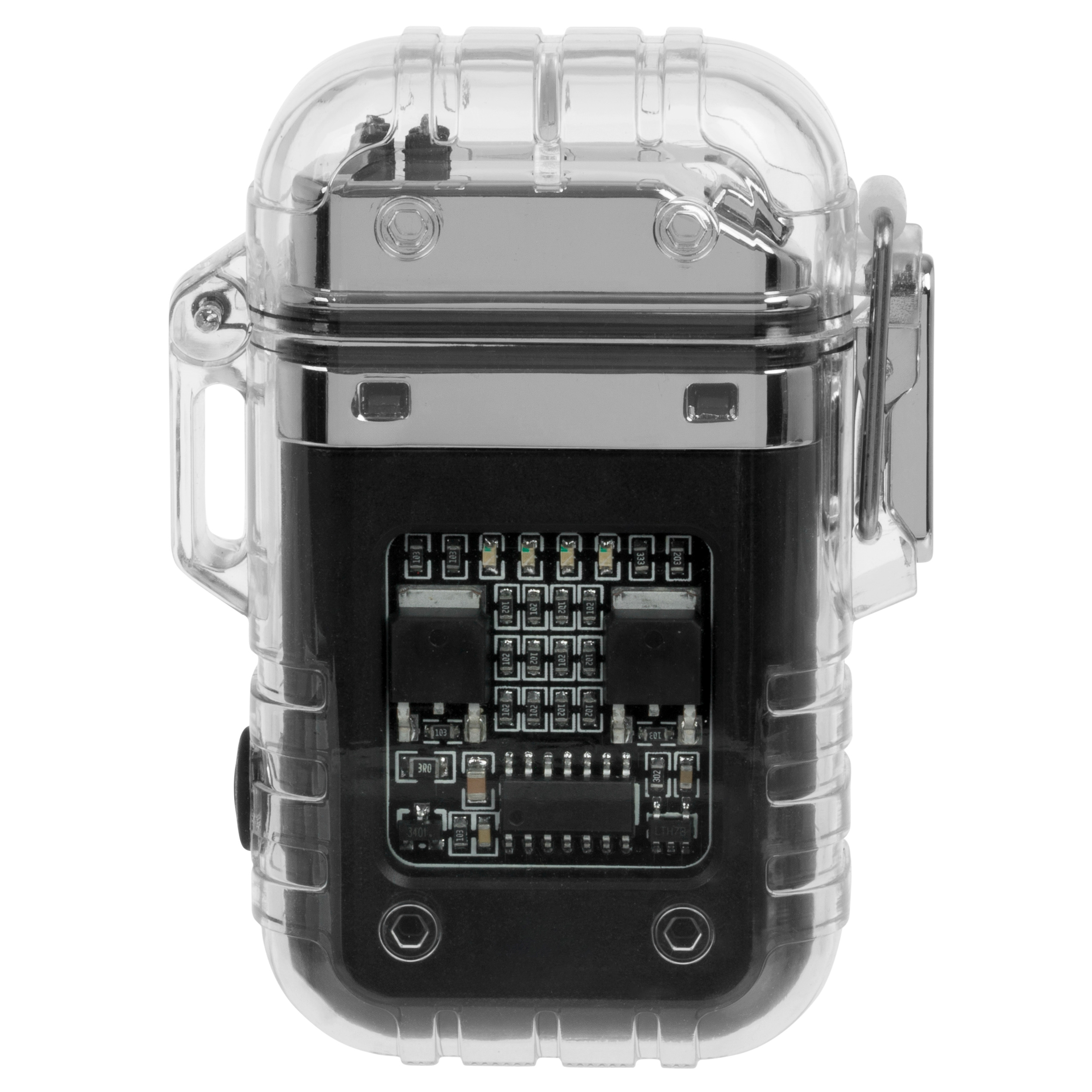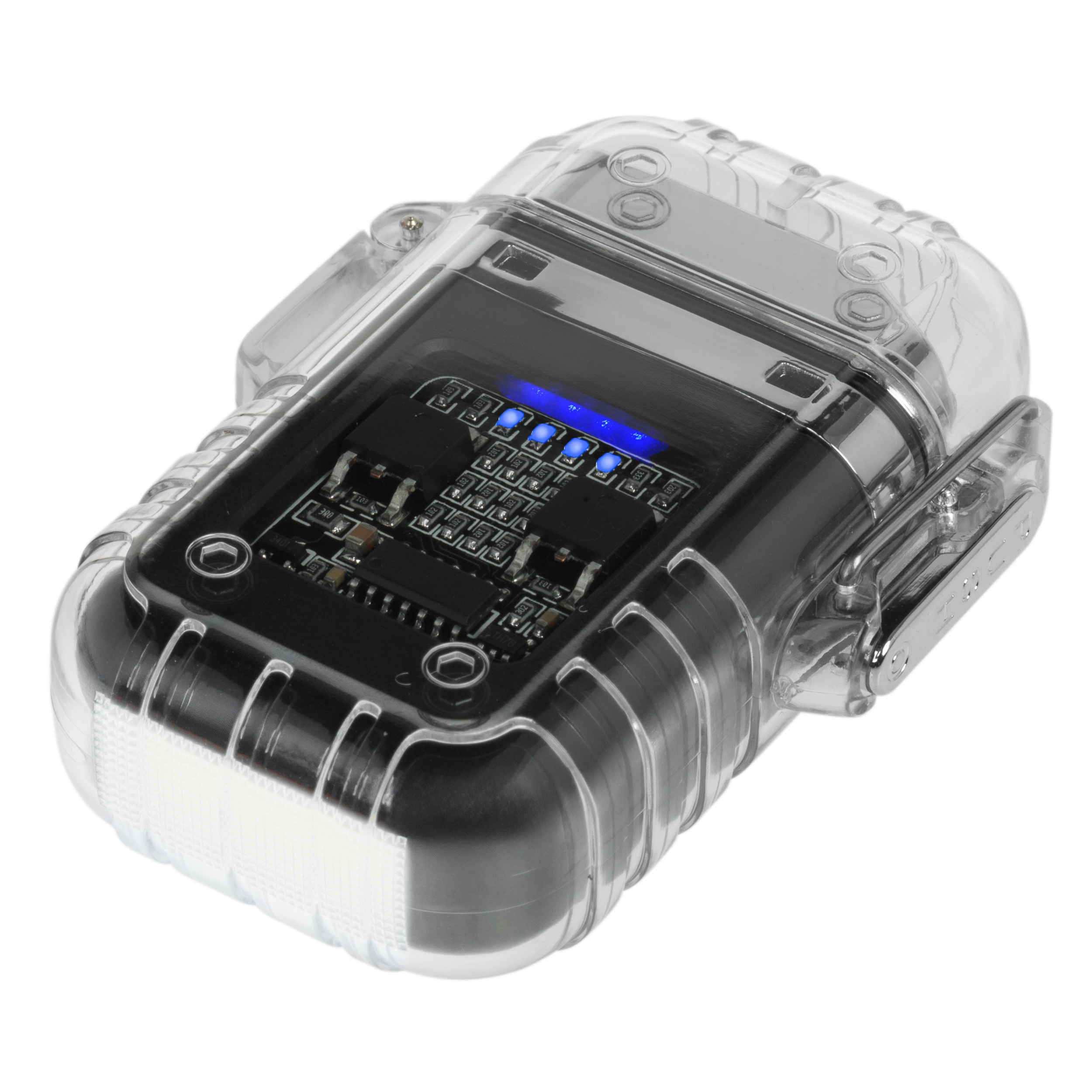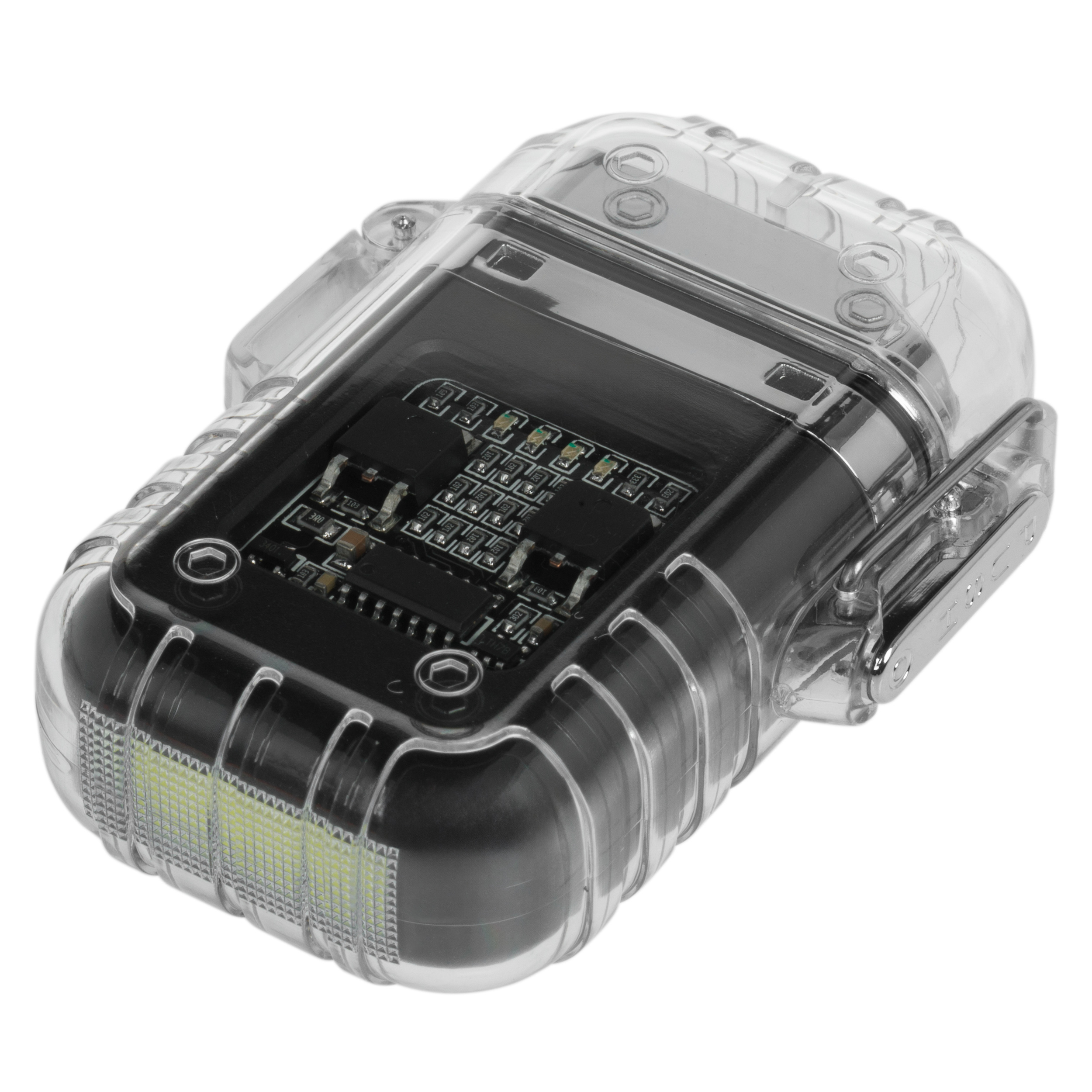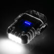 Le briquet est alimenté par une batterie rechargeable intégrée, qui se charge à l’aide du câble USB-C inclus dans le kit. Il est ainsi facile de le recharger à partir d’un powerbank, d’un ordinateur portable ou d’un chargeur secteur, ce qui est particulièrement pratique en voyage. Quatre LED sont visibles à travers le boîtier transparent, indiquant le niveau de charge de la batterie. Cela permet de surveiller l’état énergétique et d’éviter les décharges inattendues sur le terrain.