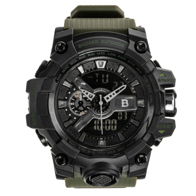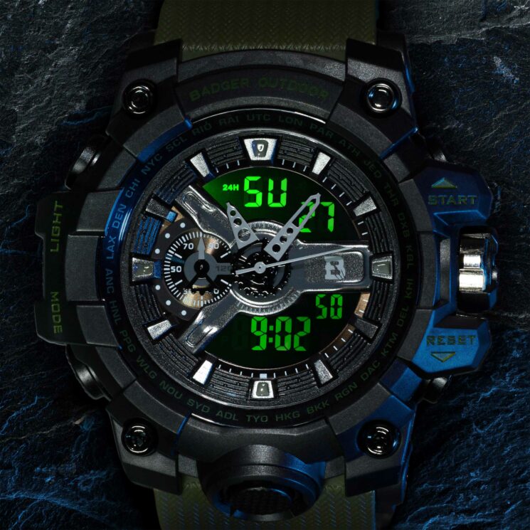 La montre est équipée d’un écran LCD à 10 chiffres qui affiche l’heure actuelle, le jour de la semaine et la date. Un autre avantage est la montre analogique avec fonction double fuseau horaire, qui vous permet de suivre simultanément l’heure dans deux fuseaux horaires différents.