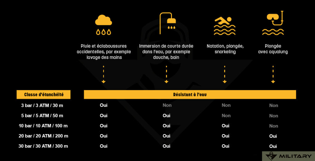L’étanchéité 5 ATM protège efficacement la montre contre la pluie, les éclaboussures et les immersions de courte durée dans l’eau.