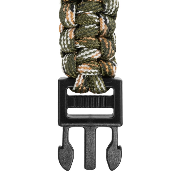 Bransoletka wyposażona jest w trwałą klamrę fastex wykonaną z tworzywa ABS, która zapewnia stabilne zapięcie i chroni przed przypadkowym rozpięciem. Tego typu konstrukcja umożliwia szybkie zakładanie i zdejmowanie bransoletki, co zwiększa wygodę użytkowania podczas wypraw i codziennych aktywności. Klamra jest lekka, odporna na uszkodzenia mechaniczne i dopasowana do nadgarstka, dzięki czemu bransoletka może być noszona przez cały dzień bez uczucia dyskomfortu. Kamuflaż camo nadaje jej taktyczny charakter i dobrze komponuje się z pozostałym wyposażeniem outdoorowym.