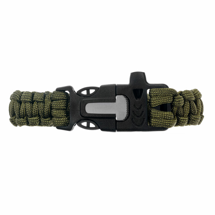 Zapięcie bransoletki wykonano z wytrzymałego tworzywa ABS, które zapobiega przypadkowemu rozpięciu i zapewnia stabilność podczas noszenia. W klamrze umieszczono szereg praktycznych elementów, takich jak krzesiwo do rozpalania ognia, gwizdek ratunkowy umożliwiający sygnalizację w sytuacjach awaryjnych oraz blaszka pełniąca funkcję miniaturowego ostrza. Takie połączenie sprawia, że bransoletka może służyć jako niewielki zestaw survivalowy, przydatny podczas każdej wyprawy w teren. Jej oliwkowy kolor wpisuje się w militarną stylistykę i ułatwia dopasowanie do odzieży lub ekwipunku taktycznego.