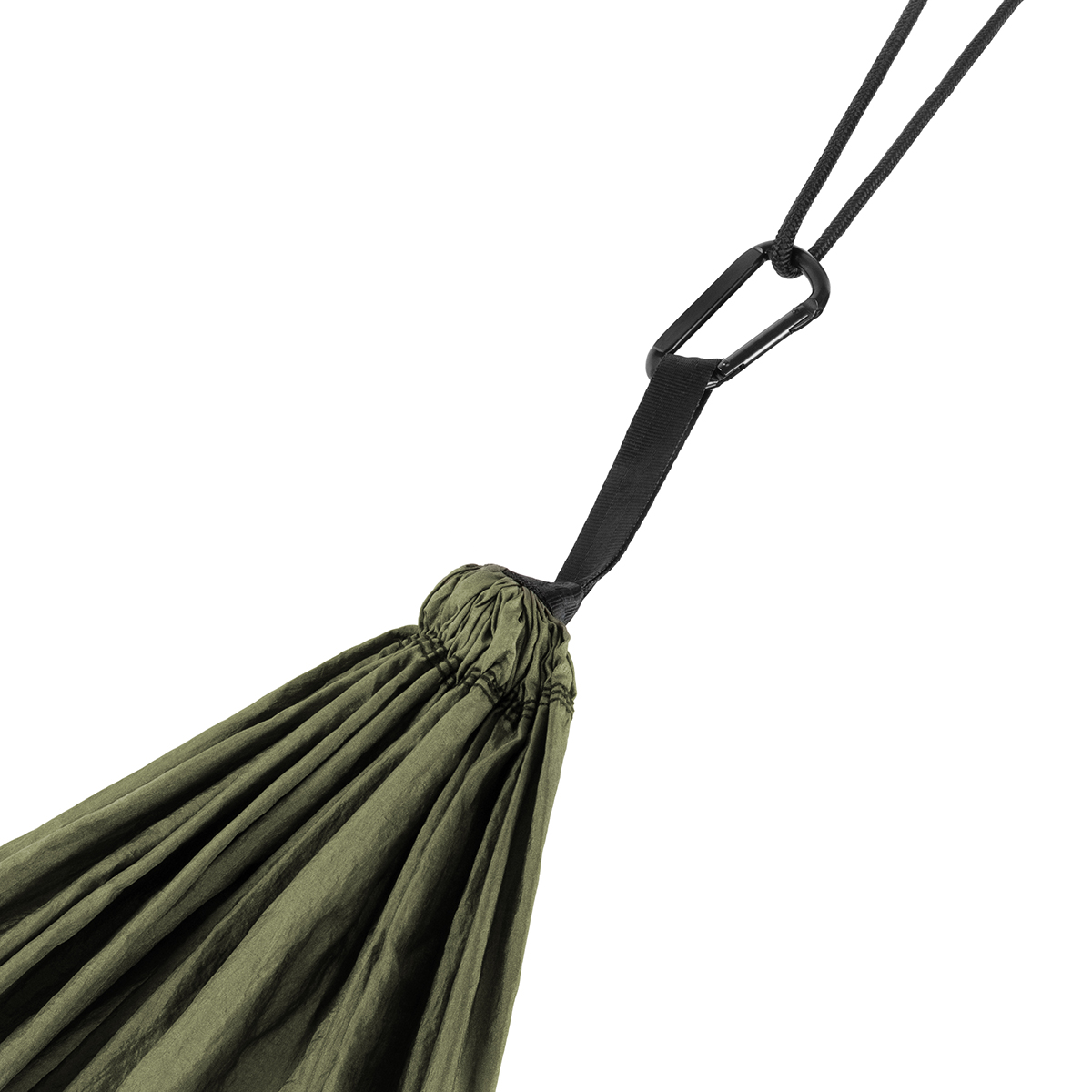Po złożeniu hamak przybiera kompaktowe wymiary 22 x 10 cm, a jego waga wynosi jedynie około 600 g. Całość mieści się w wbudowanej kieszeni typu selfpack, która pełni jednocześnie funkcję pokrowca transportowego. Pokrowiec wyposażony został w karabińczyk z tworzywa sztucznego, co umożliwia przypięcie hamaka do plecaka, torby lub paska. Dzięki temu można go łatwo przenosić i mieć zawsze pod ręką, bez zajmowania cennego miejsca w bagażu.