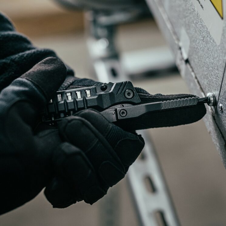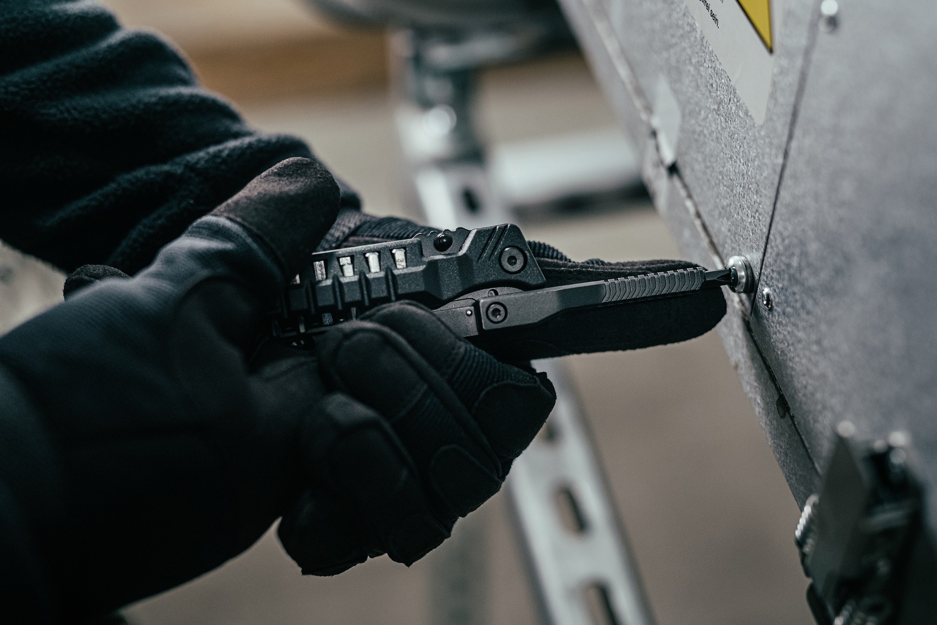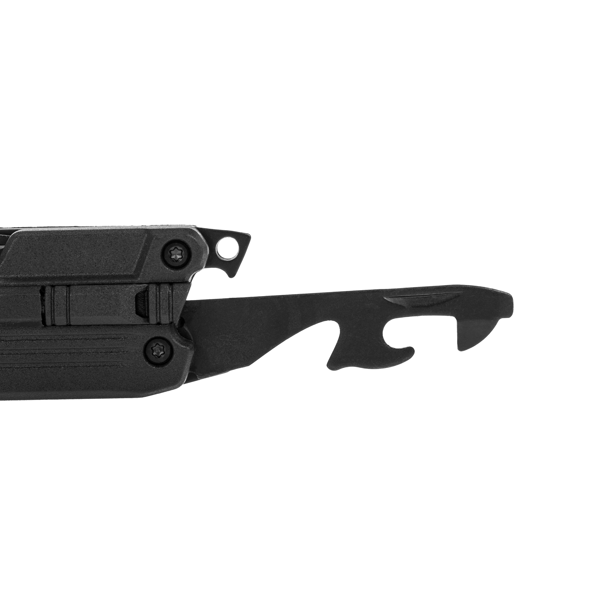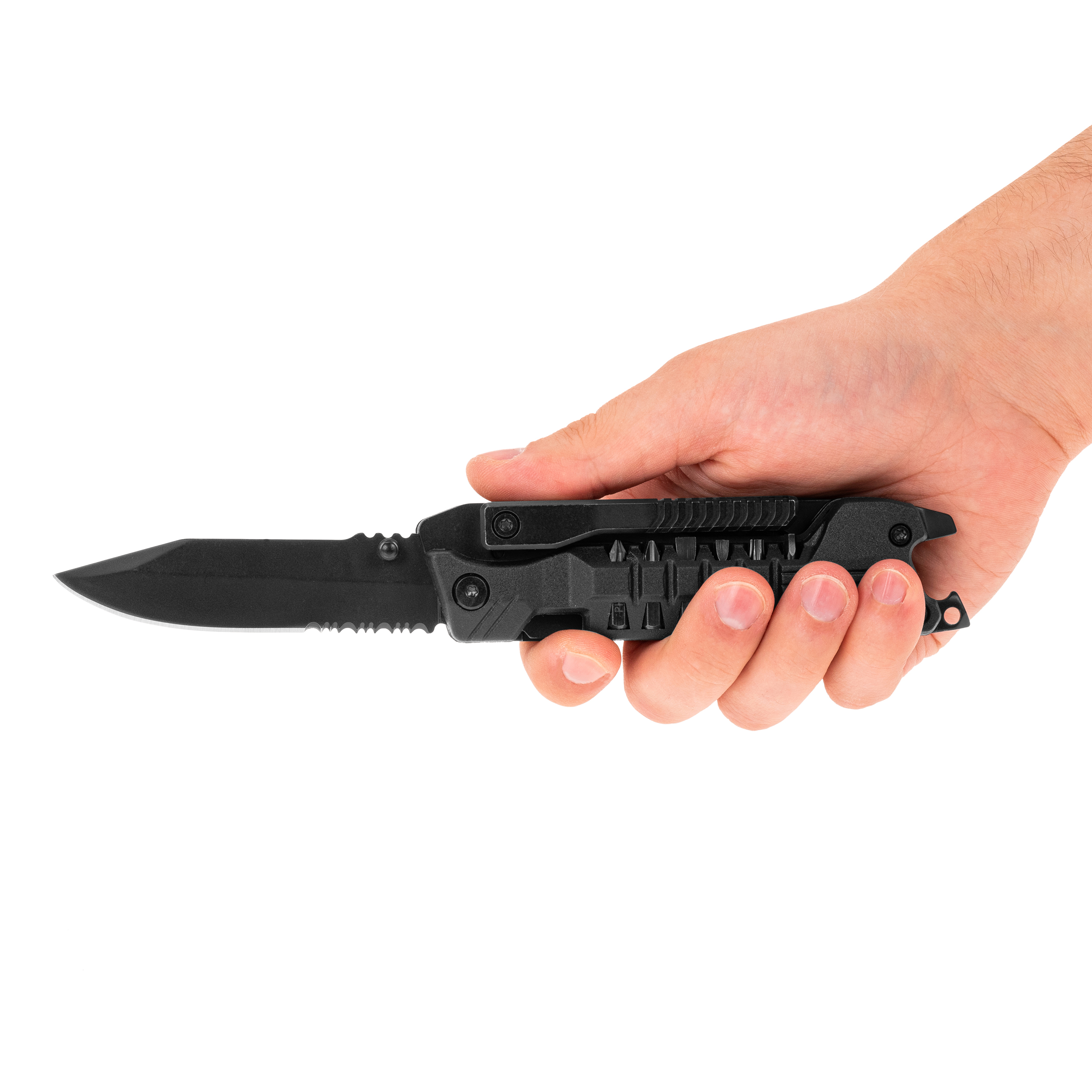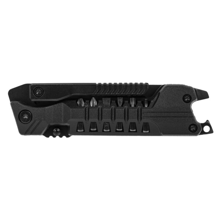 W rękojeści umieszczono krzesiwo, które generuje intensywny snop iskier, pozwalający rozpalić ogień nawet w wilgotnych warunkach. Dodatkowo w uchwycie znajduje się gwizdek alarmowy, który może służyć do wzywania pomocy w sytuacjach awaryjnych. Magnetyczna, rozkładana przedłużka do bitów ułatwia dokręcanie lub luzowanie śrub w trudno dostępnych miejscach, zwiększając funkcjonalność narzędzia podczas prac serwisowych.