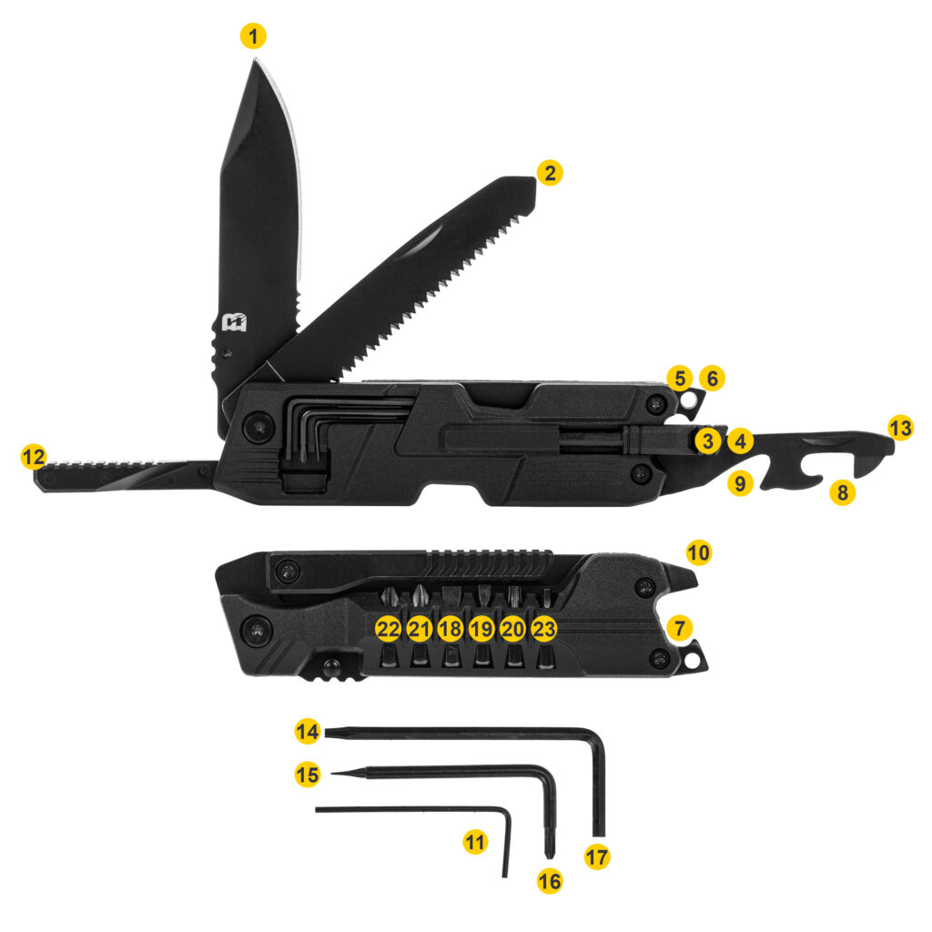 Nóż składany z częściowo ząbkowaną głownią o profilu Drop-Point wykonaną ze stali nierdzewnej 420. To lekki i solidny folder, który łączy w sobie trwałość, funkcjonalność i ergonomię. Model jest wyposażony w aż 23 różnorodne narzędzia, przydatne zarówno w codziennych sytuacjach, jak i podczas biwaków, podróży czy wypraw survivalowych. Wszystkie multitoole objęte są 10-letnią gwarancją producenta, co potwierdza wysoką jakość wykonania.
