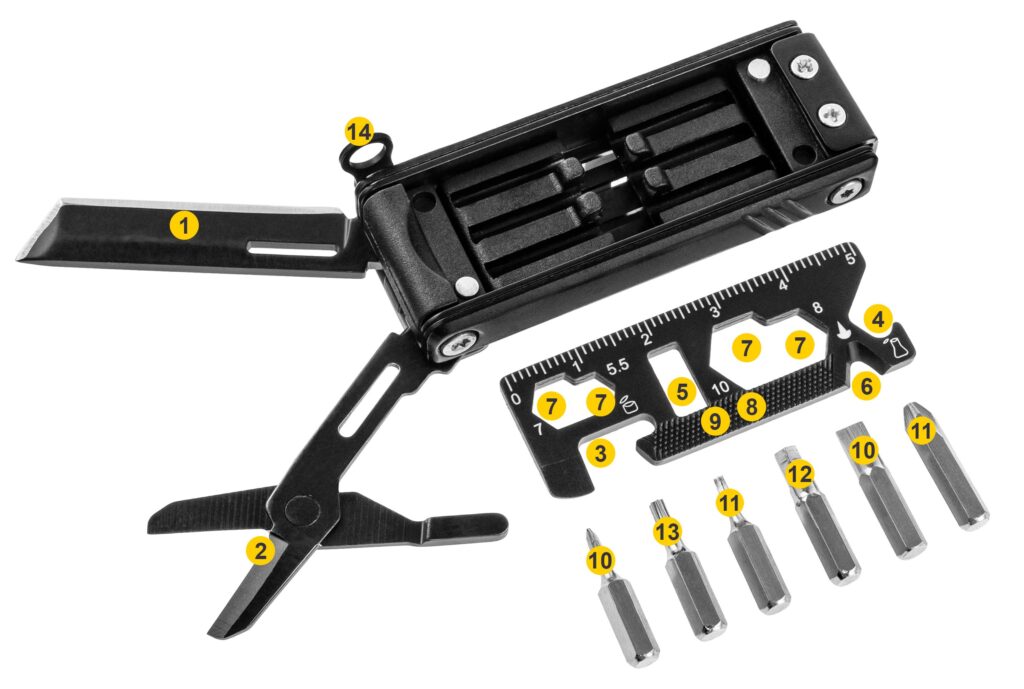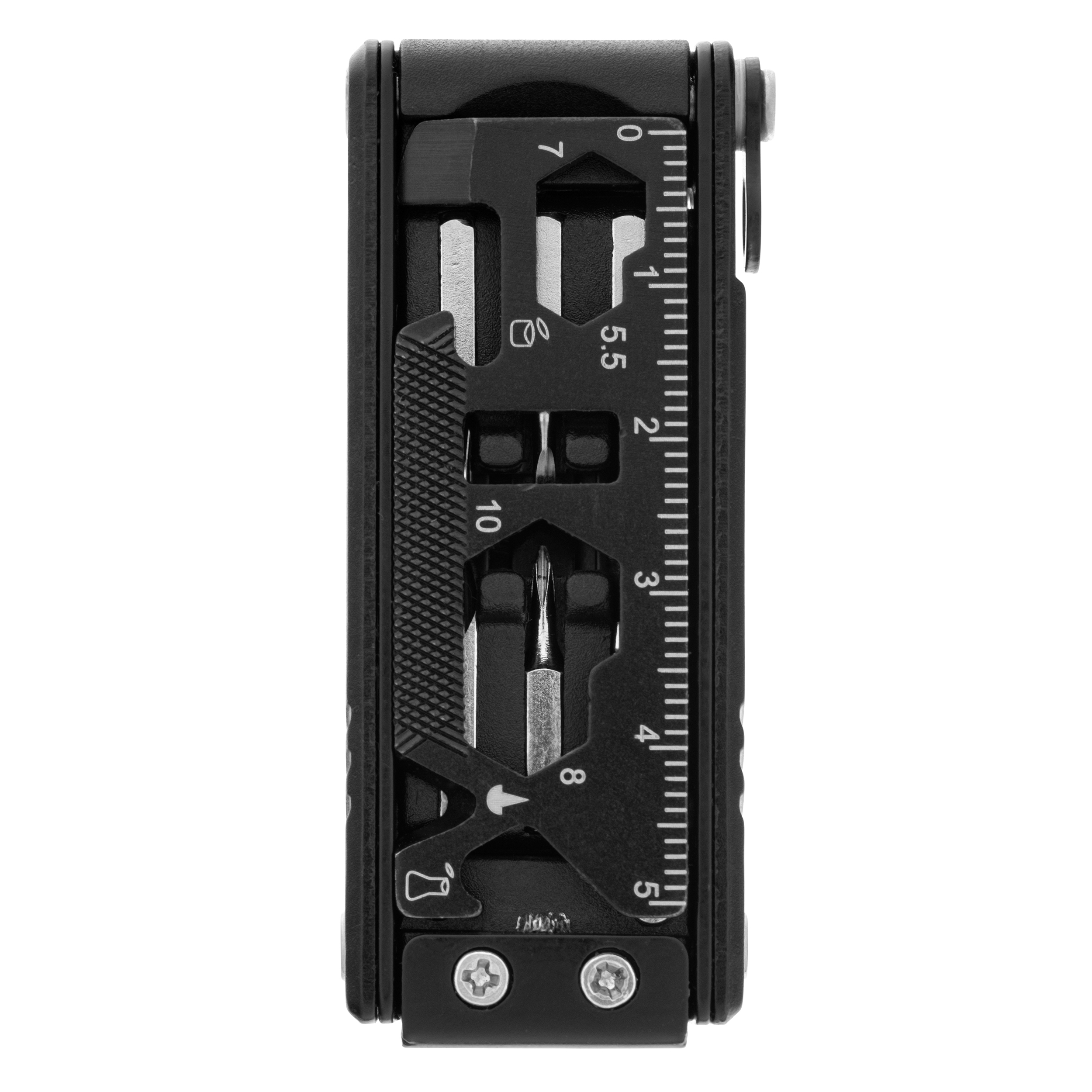 Multitool wyposażono w ostrze o profilu Tanto oraz sprężynujące nożyczki, które zapewniają precyzyjne cięcie i wygodę użytkowania. Oba narzędzia otwierane są przy pomocy otworu pod kciuk, co umożliwia ich szybkie rozłożenie jedną ręką. Zastosowany mechanizm Liner Lock skutecznie zabezpiecza ostrze i nożyczki przed przypadkowym złożeniem podczas pracy, zwiększając bezpieczeństwo podczas użytkowania.