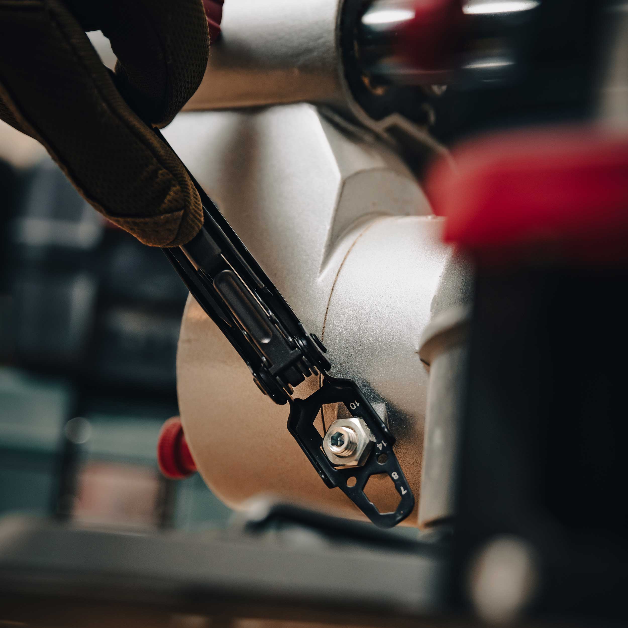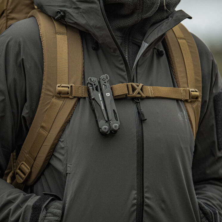 Na rękojeści umieszczono sprężysty klips, umożliwiający przypięcie narzędzia do paska, kieszeni lub elementu oporządzenia, co pozwala na szybki dostęp do multitoola w każdej sytuacji.