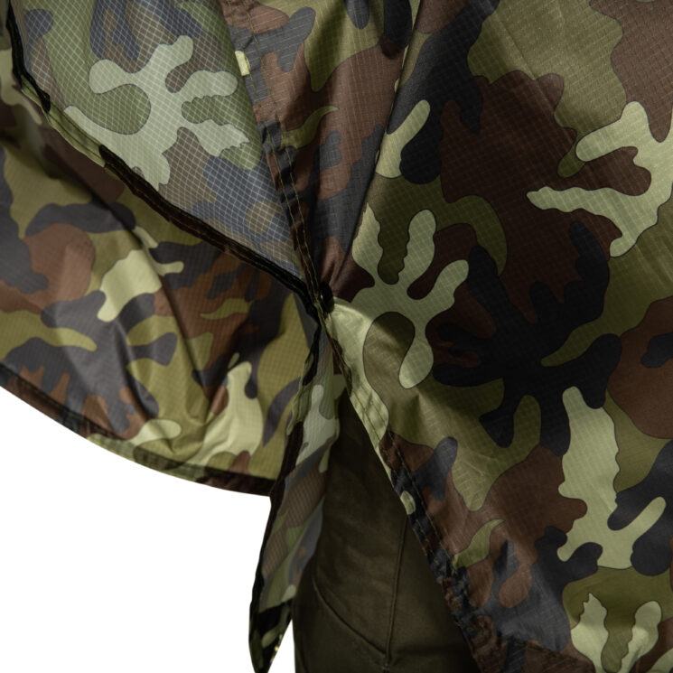 Model wyposażono w cztery metalowe otwory oraz praktyczne zatrzaski, które zwiększają jego zakres zastosowań. Po rozpięciu i odpowiednim zawieszeniu ponczo może pełnić funkcję tymczasowego schronienia lub plandeki. Zatrzaski umożliwiają również połączenie dwóch poncz, tworząc większą powierzchnię ochronną. To rozwiązanie szczególnie przydatne podczas dłuższych wypraw, gdy potrzeba dodatkowej przestrzeni chroniącej przed deszczem lub wiatrem.