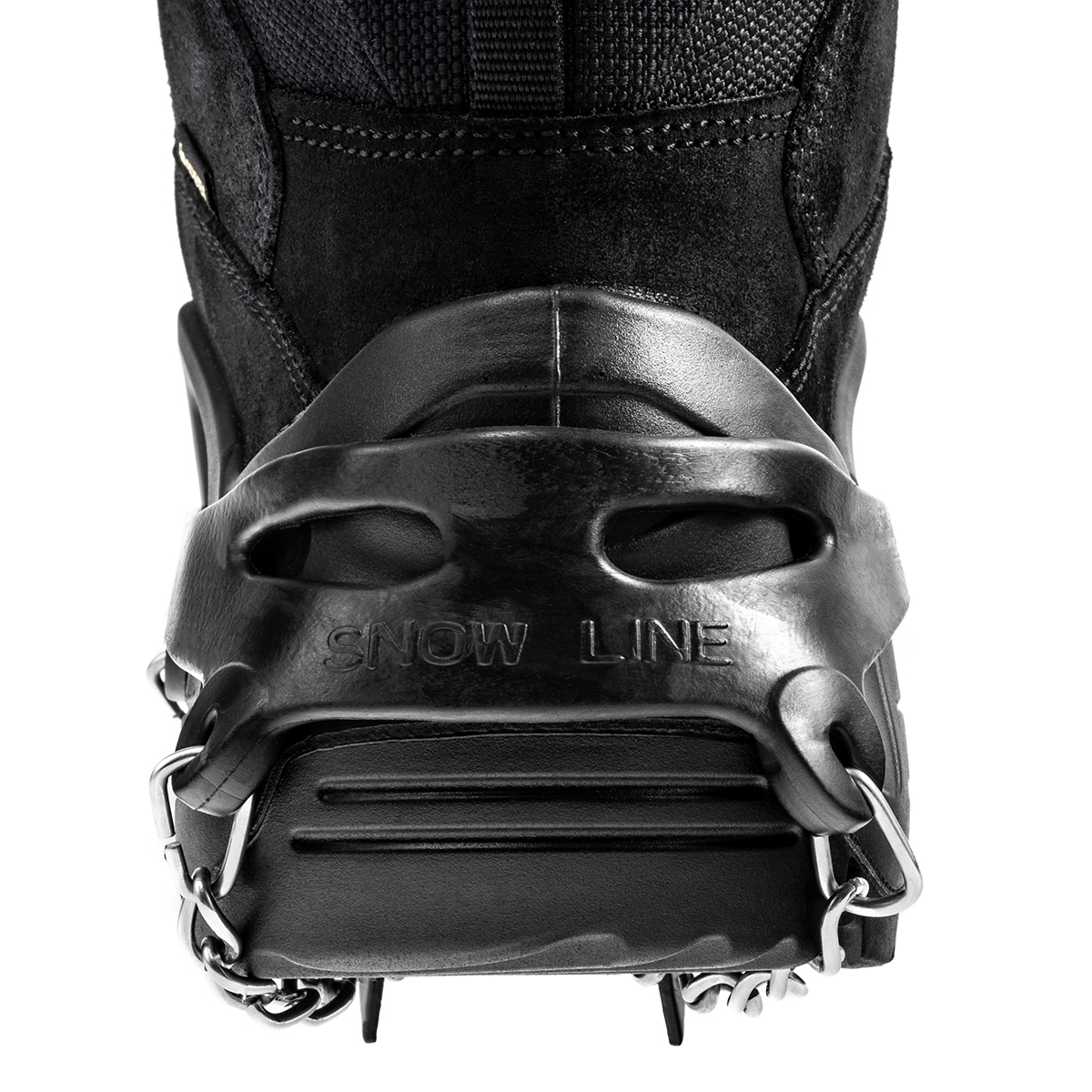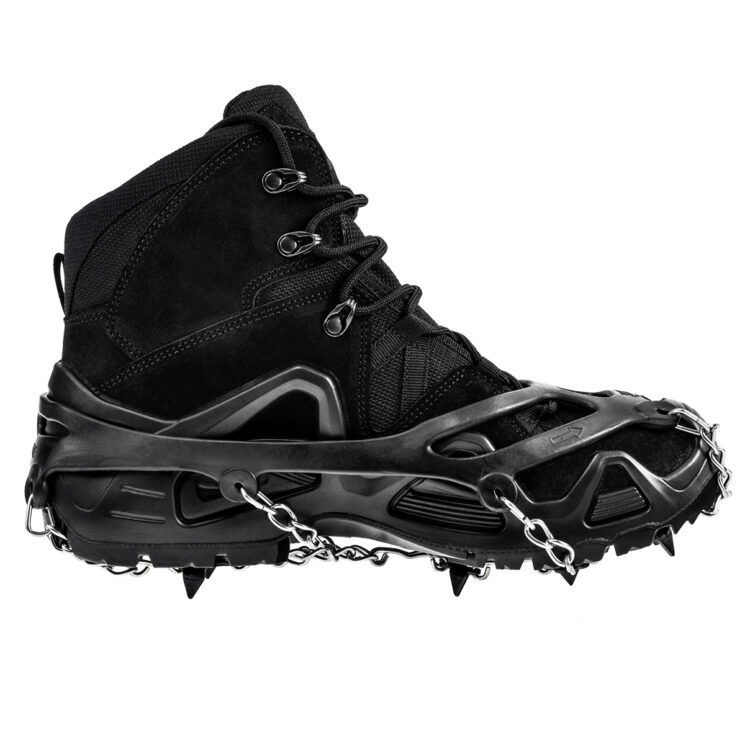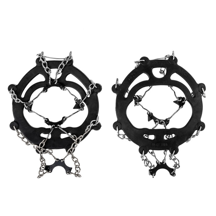 Podstawa raczków wykonana jest z trwałej stali nierdzewnej, która cechuje się wysoką odpornością na uszkodzenia mechaniczne i korozję, nawet przy częstym kontakcie z wilgocią. Konstrukcja została wyposażona w 8 ostrych zębów o wysokości 12 mm, zapewniających pewne wbicie w lód, ubity śnieg lub twarde podłoże. Stalowy łańcuch o grubości 2 mm stabilizuje całą konstrukcję, zapobiegając przesuwaniu się raczków podczas chodzenia. Dzięki precyzyjnemu rozmieszczeniu zębów uzyskano optymalną przyczepność i równomierne rozłożenie nacisku, co zwiększa komfort poruszania się w zróżnicowanym terenie. Całość jest odporna na odkształcenia i zachowuje swoje właściwości przez wiele sezonów zimowych.