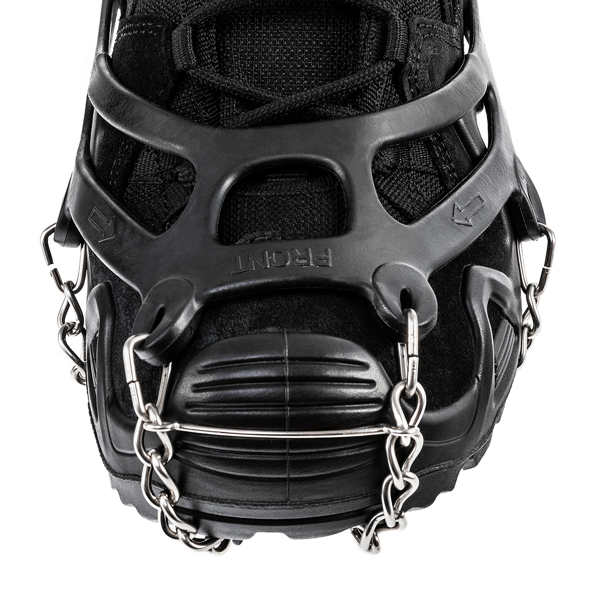 Raczki wyposażono w elastyczną obręcz z wytrzymałej gumy, która umożliwia szybkie zakładanie i zdejmowanie bez potrzeby użycia dużej siły. Guma dobrze przylega do cholewki buta, zapewniając stabilne trzymanie się podczas marszu. Materiał zachowuje swoją elastyczność nawet w niskich temperaturach, co zapobiega jego pękaniu. Konstrukcja obręczy umożliwia dopasowanie raczków do różnych rodzajów obuwia – trekkingowego, turystycznego czy zimowego – dzięki czemu są uniwersalnym rozwiązaniem dla szerokiego grona użytkowników. Uniwersalny rozmiar w zakresie 36-45 pozwala na ich komfortowe użytkowanie przez większość osób.