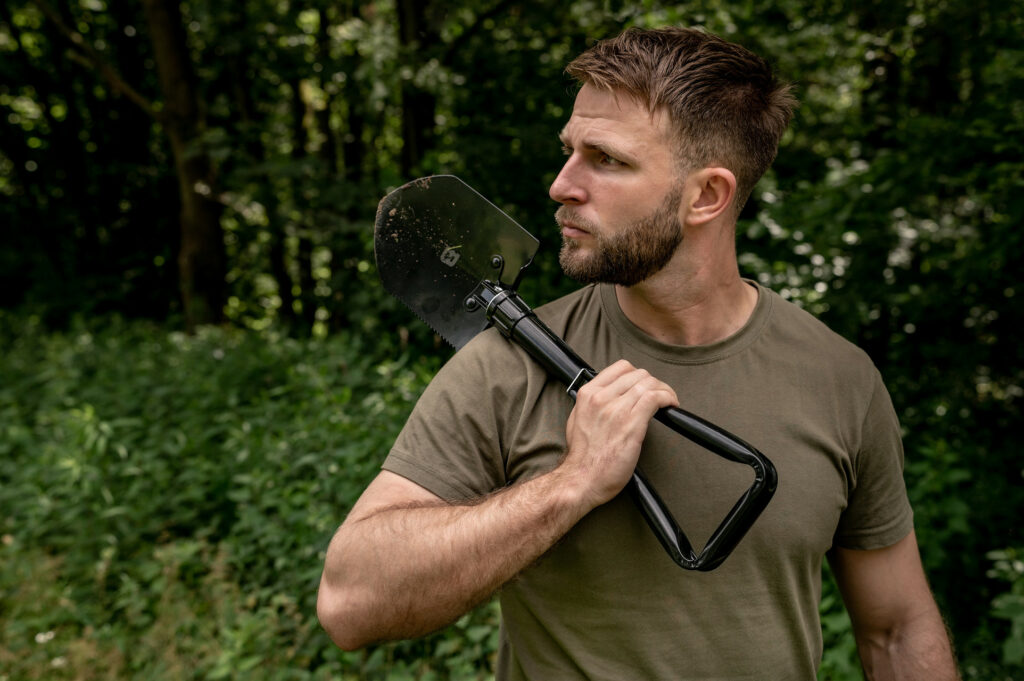 Działania taktyczne: Saperka sprawdza się przy budowie prostych umocnień, tworzeniu niewielkich okopów, zakopywaniu wyposażenia lub przygotowywaniu elementów maskujących.