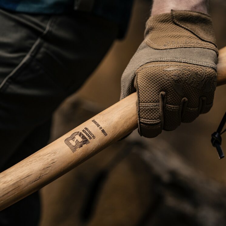 Trzonek wykonano z drewna orzesznika, znanego ze swojej twardości i odporności na pęknięcia. Ergonomiczny kształt zapewnia pewny chwyt, a naturalna struktura drewna tłumi drgania, zwiększając komfort pracy nawet podczas długiego użytkowania. Głowica jest solidnie osadzona na trzonku, co zapewnia stabilność i bezpieczeństwo w czasie uderzeń. W dolnej części rękojeści umieszczono otwór z linką, który umożliwia zawieszenie siekiery na haku lub zabezpieczenie jej na nadgarstku podczas przenoszenia.