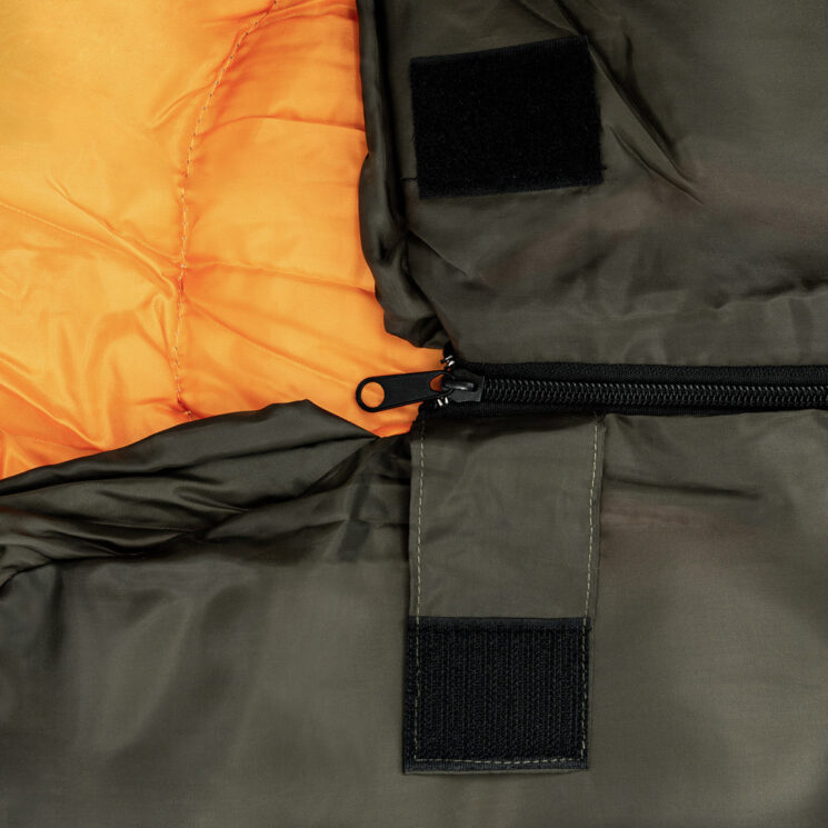 Śpiwór wyposażony jest w zamek błyskawiczny po prawej stronie, który umożliwia łatwe otwieranie i zamykanie nawet w nocy. Duże wymiary wynoszące 220 x 75 cm zapewniają komfortowy sen i odpowiednią przestrzeń dla użytkownika. Oliwkowy kolor zewnętrzny dobrze komponuje się z naturalnym otoczeniem, natomiast pomarańczowe wnętrze inspirowane kurtkami MA1 zwiększa widoczność i nadaje całości charakteru militarnego.
