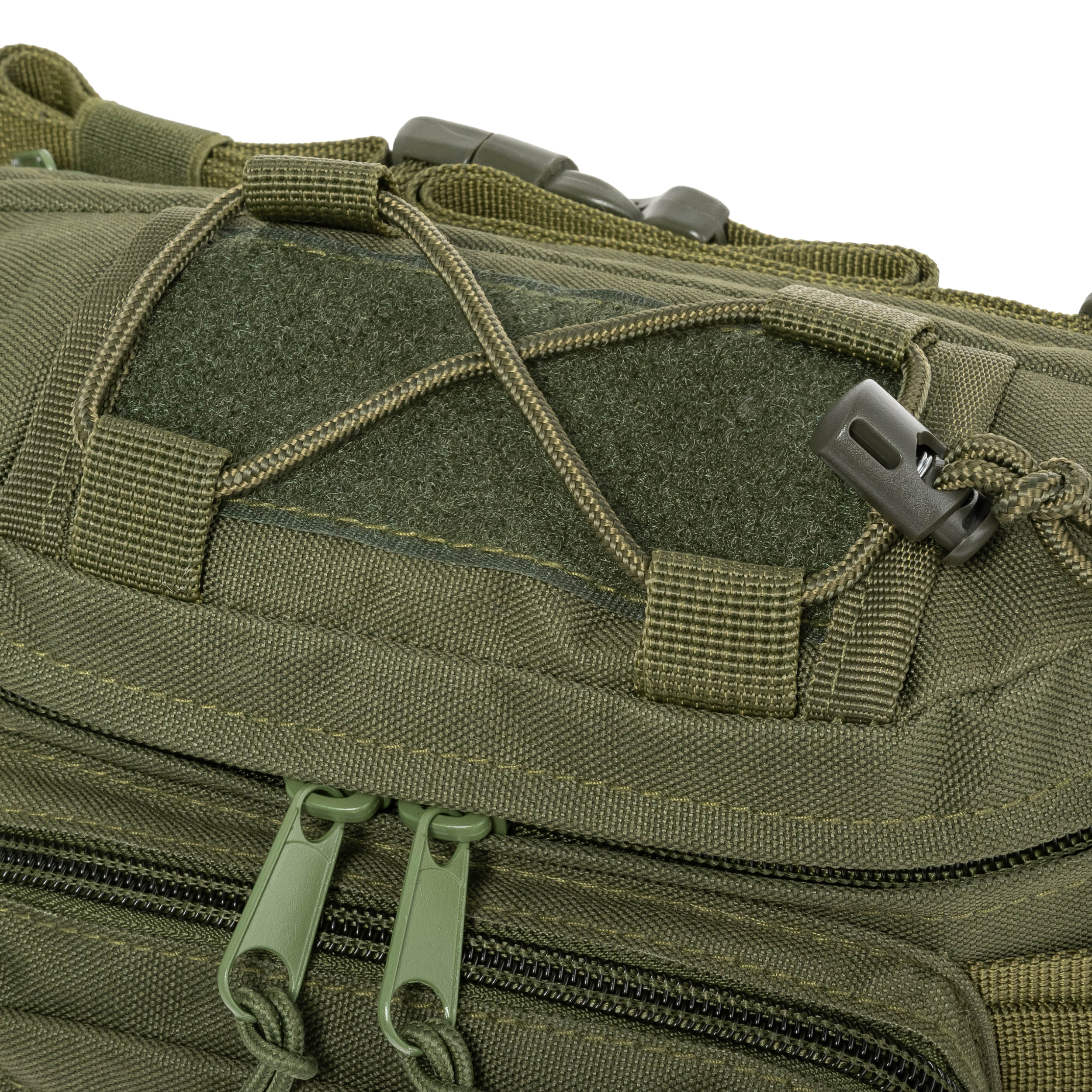 Na bokach oraz z tyłu torby naszyto taśmy w systemie MOLLE/PALS, które umożliwiają przytroczenie dodatkowego ekwipunku, kieszeni lub narzędzi. Dzięki temu torbę można również zamontować jako ładownicę na plecaku lub kamizelce taktycznej. Na górnej części komory głównej umieszczono rzep Velcro oraz linkę ze stoperem do zamocowania lub zabezpieczenia przedmiotów, takich jak rękawiczki, karabińczyk czy latarka. Na froncie torby znajduje się panel Velcro, pozwalający na personalizację wyglądu poprzez przyczepienie naszywek, flag, godła lub tzw. morale patches. To rozwiązanie nadaje torbie charakterystyczny, militarny wygląd i zwiększa jej funkcjonalność.