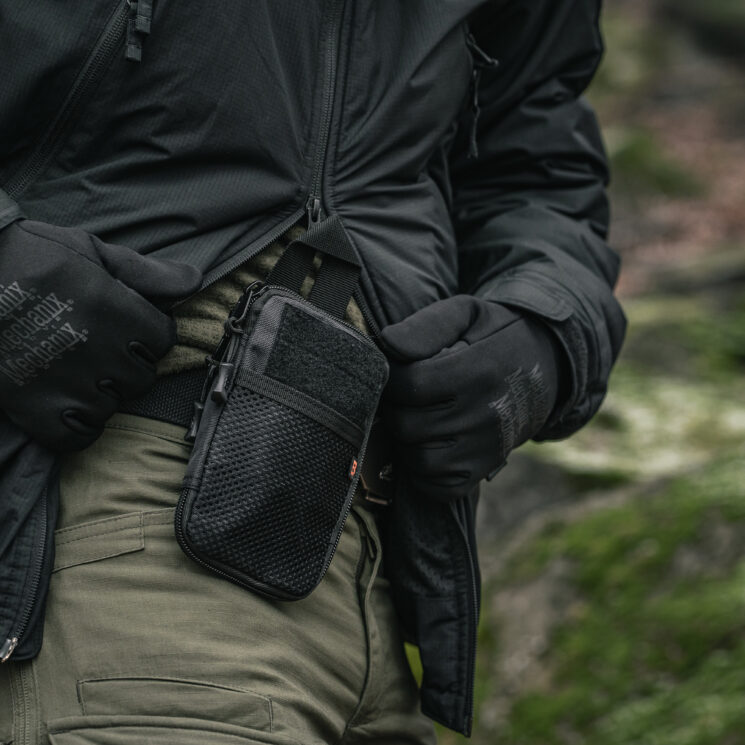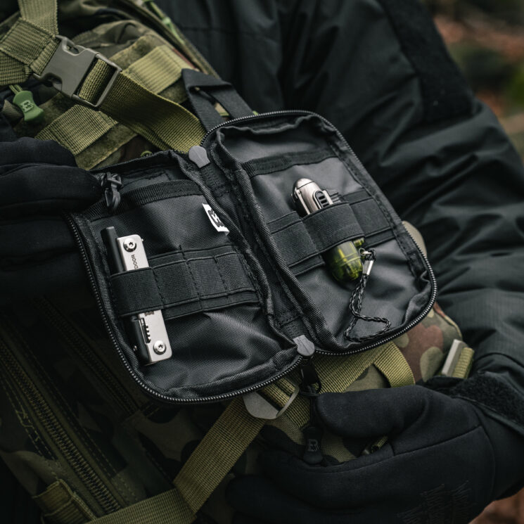 The organizer is equipped with a two-way zipper, which makes it easy to quickly open from both sides, even when wearing gloves or working in harsh conditions. The interior has been designed for efficient arrangement of the contents – there are elastic straps for secure fastening of items, as well as a carabiner for keys or small accessories. On the front of the organizer, there is a Velcro panel that allows for customization by attaching patches, flags, or morale patches. An additional mesh compartment makes it easy to quickly locate small items without having to remove them.