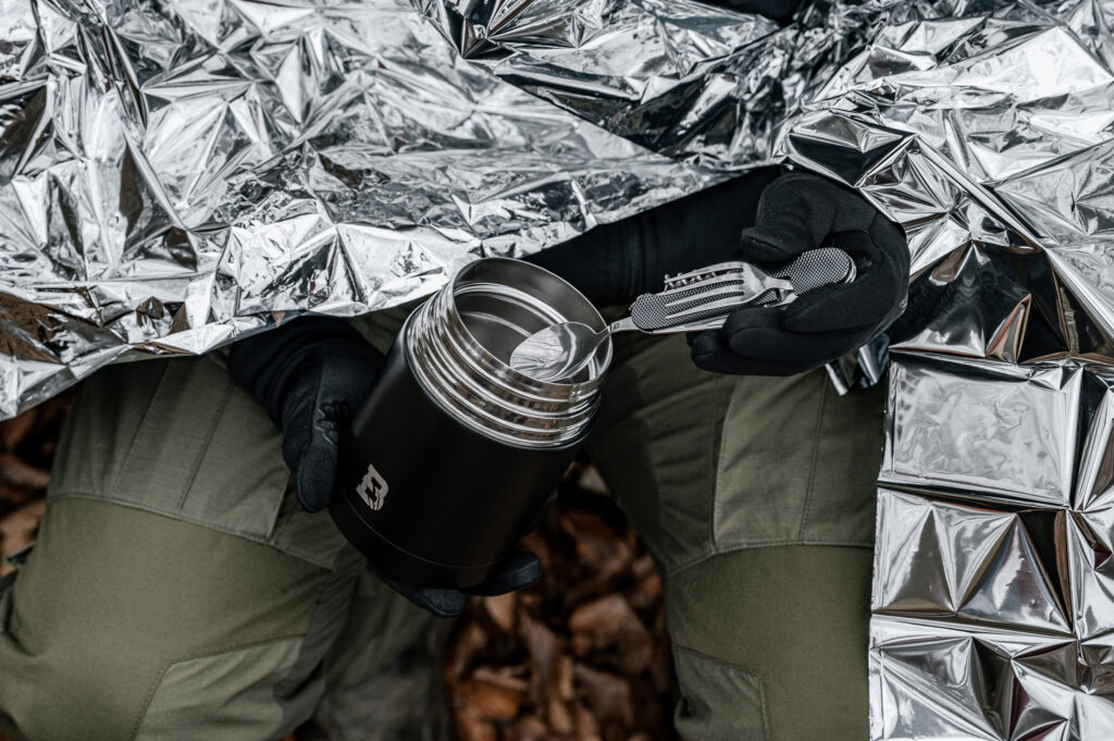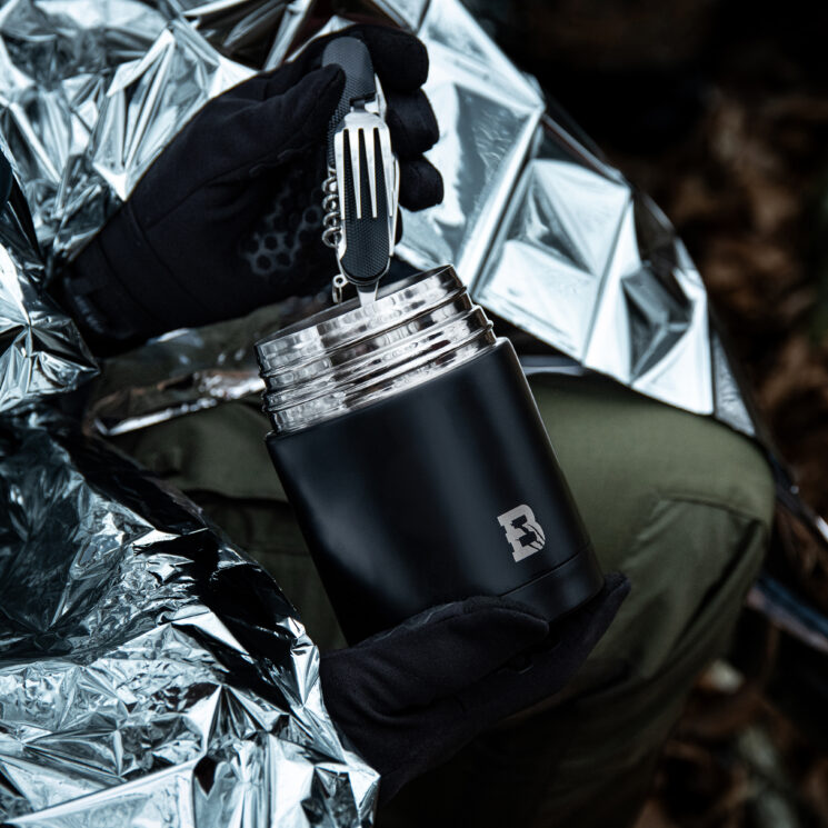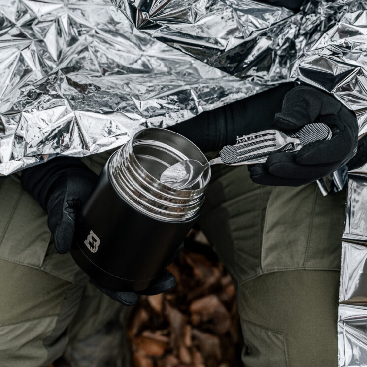 600 ml thermos designed to carry hot or cold food in the field and everyday use. Made of high quality 304 stainless steel coated with a matte black protective coating, which increases resistance to damage and corrosion. The material is BPA-free and will not affect the taste or smell of stored food. The wide filler makes it easy to fill, clean and conveniently consume food directly from the thermos.