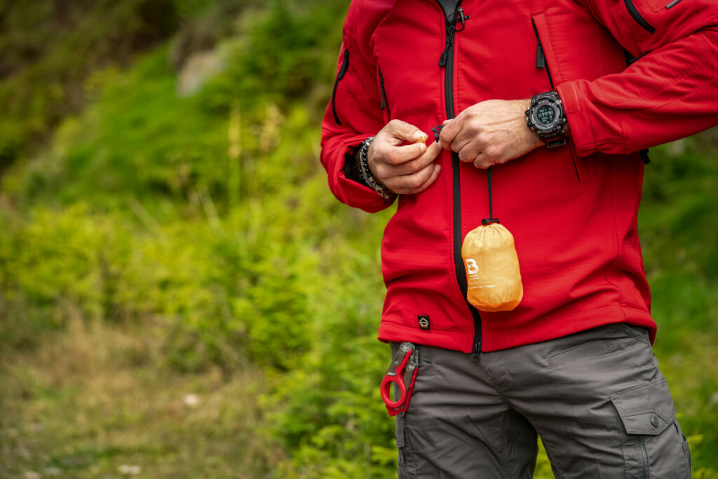 The set includes a transport bag with a drawstring, which allows for convenient transport and protects the poncho from dirt. In addition, the set includes an emergency whistle, which is a useful piece of equipment in emergency situations, e.g., when calling for help. The set is lightweight, compact, and ready for immediate use in the field.