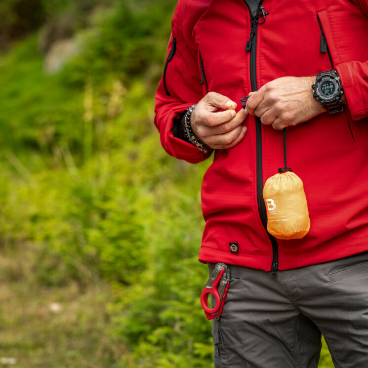 The poncho is made of waterproof plastic, which effectively protects against moisture and wind. The double-sided metallized coating in silver and orange reflects up to 90% of heat, maintaining optimal body temperature. The silver side insulates against the cold, while the orange side increases the user’s visibility, which is crucial during rescue operations. High resistance to tearing and abrasion allows the poncho to be used repeatedly in various terrain conditions. The material used is also lightweight, flexible, and does not restrict movement, which increases comfort during use in the field.