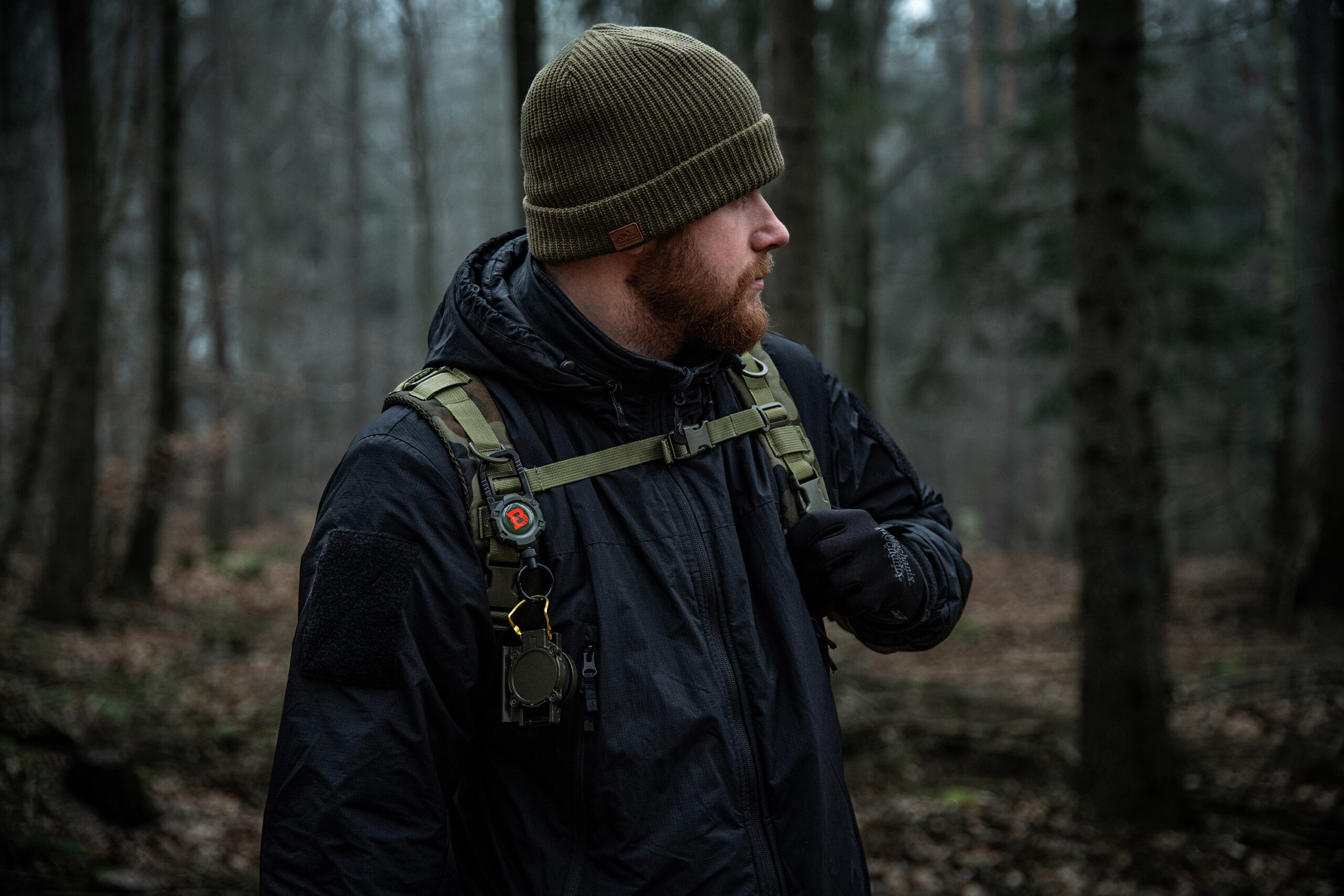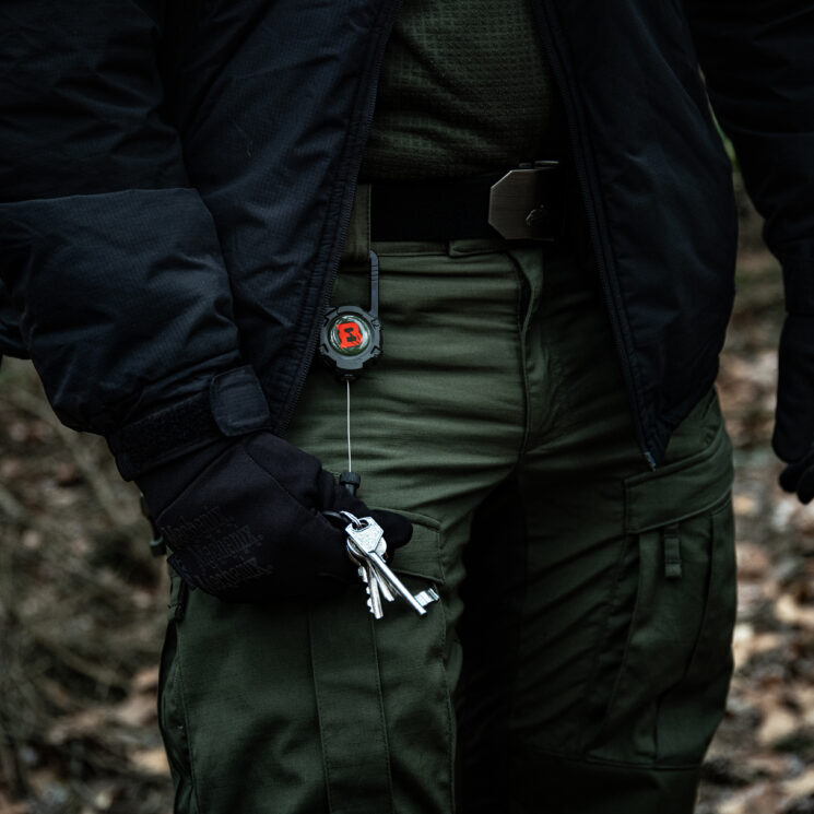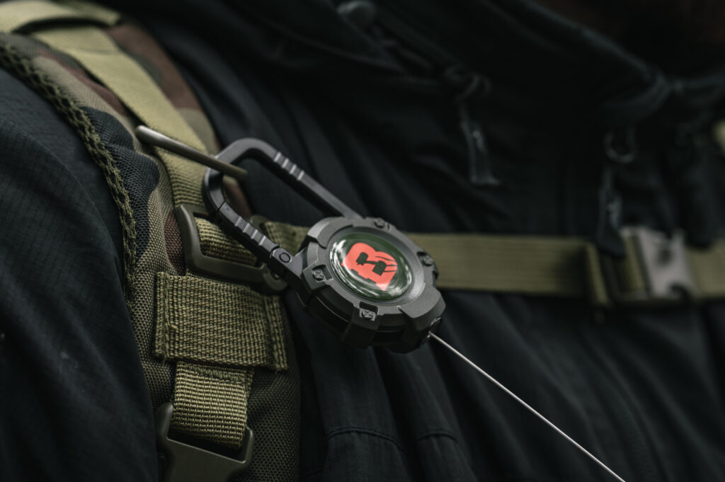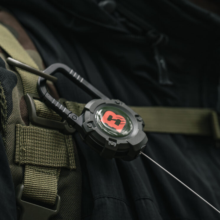 A durable steel carabiner integrated with the retractor body allows for easy and stable attachment to a belt loop, belt, backpack strap, or other accouterment. The robust design guarantees a secure hold even during intensive use in the field. The cord ends with a steel ring with a diameter of 33 mm, which allows you to quickly attach keys, access cards, ID badges, or small tools. The whole thing makes for a reliable and practical accessory, ideal for both everyday use and outdoor applications.